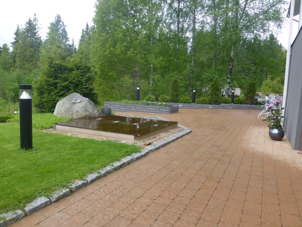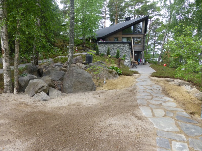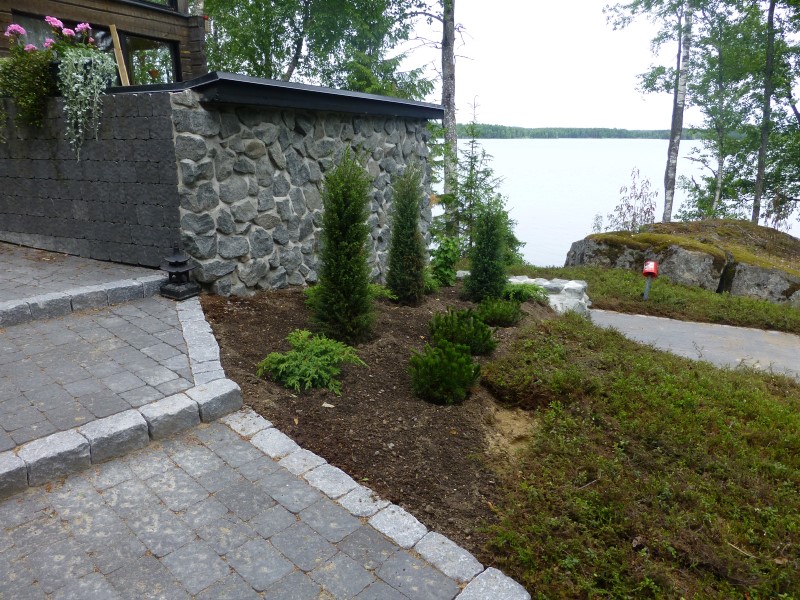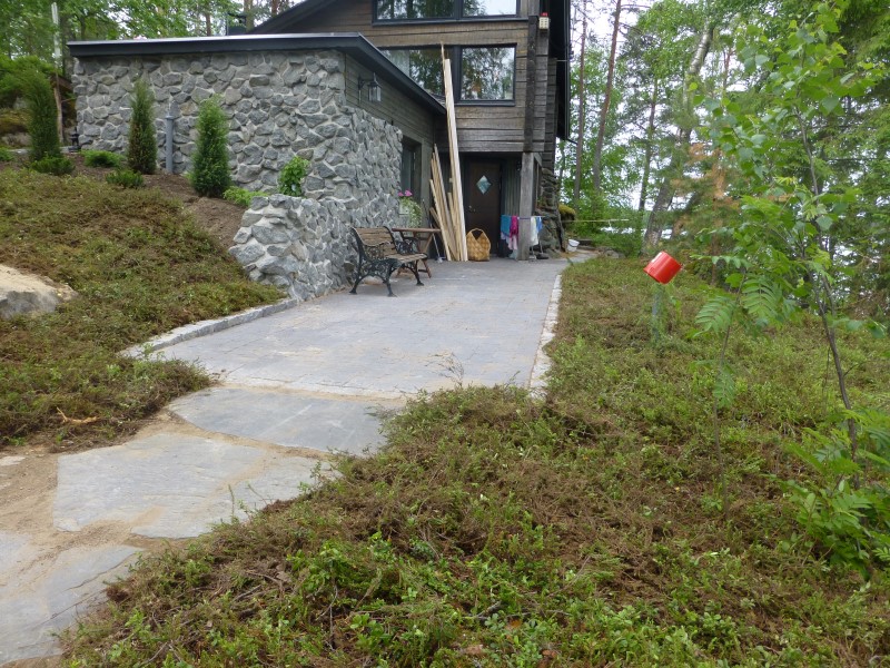 Helppohoitoinen mökkipiha. Kohteessa asennettiin kunttaa eli metsänpohjaa. Kiveys tehtiin Ruduksen Veronakivellä ja reunakiveksi asennettiin graniittinen nupukivi. Erikoisuutena tässä kohteessa verhoiltiin mökin laajennusosan seinät luonnonkivellä. Luonnonkivestä tehtiin myös pieni muuri, joka jatkuu luonnollisesti suoraan seinäpinnasta.
